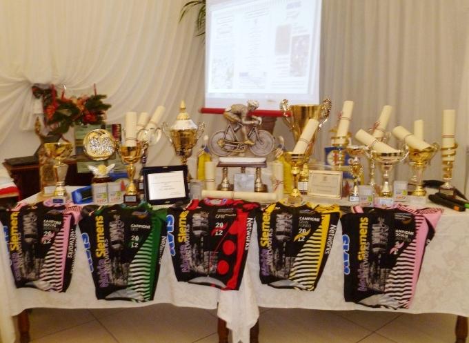 Sopra: con il "Lingottino d'Argento" di Andrea Noè, le pergamene, i Trofei e le numerose Coppe conquistate nel corso della stagione nei raduni domenicali dai soci e le maglie dei Campioni Sociali.